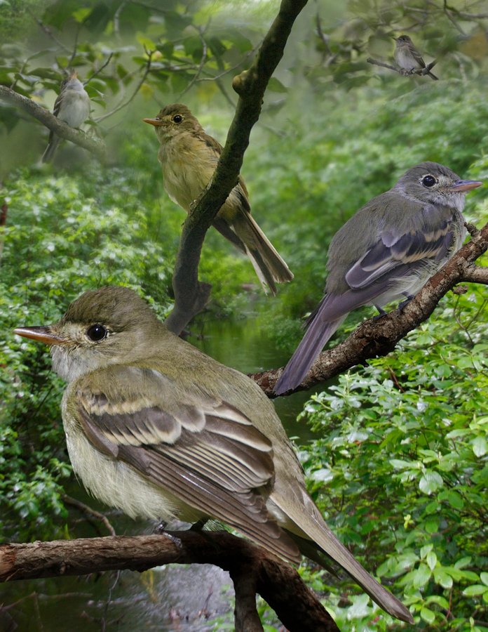 Fairly common in wet swampy s. woodland, but also drier deciduous forest in N. Tough to see as it flits around, usually higher in the canopy than other flycatchers. Listen for song — an emphatic ‘wake-up/pizza.’ Often rapidly repeated ‘pip’ notes. Adult molts late summer on breeding ground. ID: A larger empid with a long broad-based bill (mostly orange) and sloping crown peaking behind eye. Long, broad tail. Primary projection long. Fairly distinct white eyering with extensive pale loral area. Plumage varies, sometimes with green upperparts like YBFL but others duller. Underparts usually have yellow wash across breast. Adult: wing bar buff but often appears white through summer. Juv: wing bar orange-buff.
