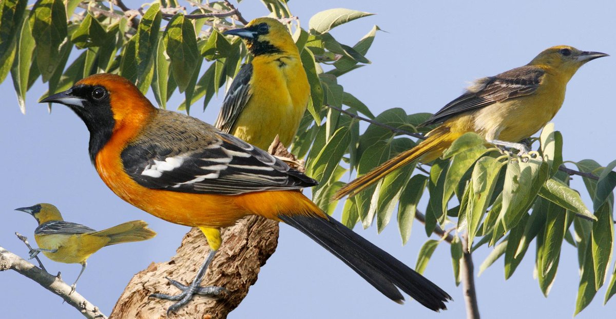 Uncommon along Rio Grande Valley, TX. Visits feeders. Largest oriole. All plumages orange. Black bib and lores. Sexes alike. Ad: mostly black upperparts, orange median coverts, white wing bars.