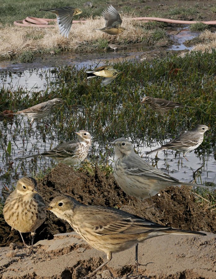 A common Arctic rocky tundra breeder. Formely called Water Pipit, Buff-bellied Pipit in Europe. In winter, forms flocks on bare earth or short grass farmland and in wet muddy areas. Walks and sometimes runs around feeding actively and will freeze when disturbed. Head jerks backward and forward as it moves. Pumps tail up and down when standing. Will 'up and away' considerable distances for no apparent reason. ID: Highly variable. A slim pipit with fairly long tail; pale-based narrow bill. All plumages have bold eyering, supercilium, and malar with uniform ear coverts but no eyestripe. Upperparts pale gray-brown with diffuse streaks. Leg color variable, most black but some red or pink. Ad br: underparts buff or orange-buff with streaking across breast and lightly down flanks. Nonbr: paler underparts, usually buff but some very pale with extensive bold streaking.