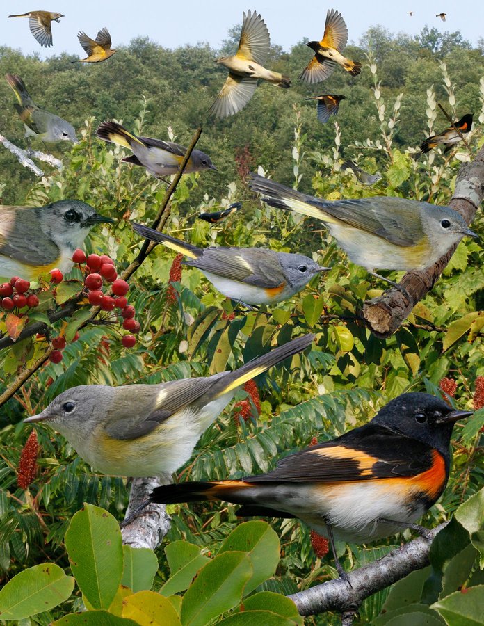 Very common breeder in deciduous forest. Often the commonest migrant, particularly in early fall. Always active, often fluttering ‘butterfly-like’ as they drop down to catch insects. Short broad bill, rictal bristles, and long tail that is fanned . Flits from branch to branch, leaning forward and rotating from side to side. Often partially opens wings and spreads tail to reveal patches of yellow and orange. Then it’s off again. Song variable, usually a number of sweet high-pitched notes trailing off at end. ID: Striking shape and behavior. Yellow/red bases to flight feathers and long rounded tail. Same color pattern for all but ad ♂. Ad ♂: black, red, and white year-round. Ad ♀: underparts pale with breast sides yellow to orange. Gray head contrasts with browner back. Broad yellow bases to flight feathers. 1st-w ♂: overlaps with ♀ but often brighter orange breast sides and stronger contrast between head and back. In spring has black adult-like feathers on head and neck. 1st-yr ♀: palest breast sides, narrow wing bar.