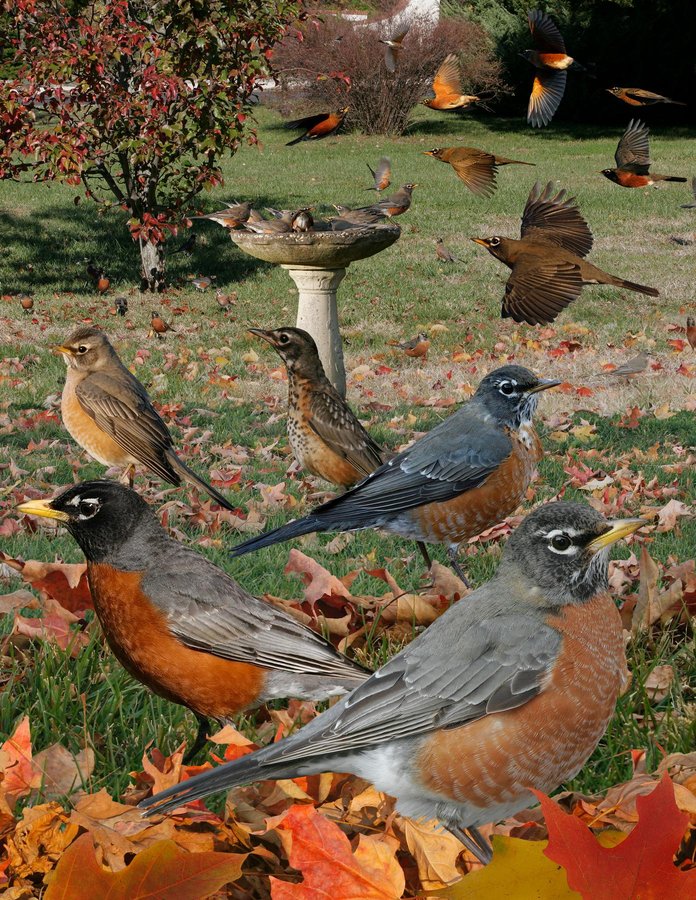 Very common and familiar in gardens, fields, and just about anywhere with trees or bushes. Often tame and approachable. Takes a few hops and stops to pull out a worm. Sometimes will stay motionless for a while with head tilted as if looking with one eye. Follow it and it will often go to its nest, usually just above head height in the fork of 2 branches. In fall migrates s., often in waves of hundreds or thousands in evenly spaced, flight which is strong and direct. They suddenly descend on trees laden with fruit or berries and glut themselves. Newly cultivated or flooded fields are also favorites. Musical song. ID: Sturdily built Turdus. Ad ♂: gray upperparts. Black head with bold eyelids, bright burnt-orange underparts. Ad ♀/imm ♂: all colors duller, underparts pale-tipped. Imm ♀: dullest with brown rather than gray back, extending onto head with indistinct supercilium. Pale orange underparts. Juv: dark-spotted underparts, pale spotted upperparts. Plumage molted out in a few weeks, though remnants can often be seen through fall — these birds can be aged and usually sexed.