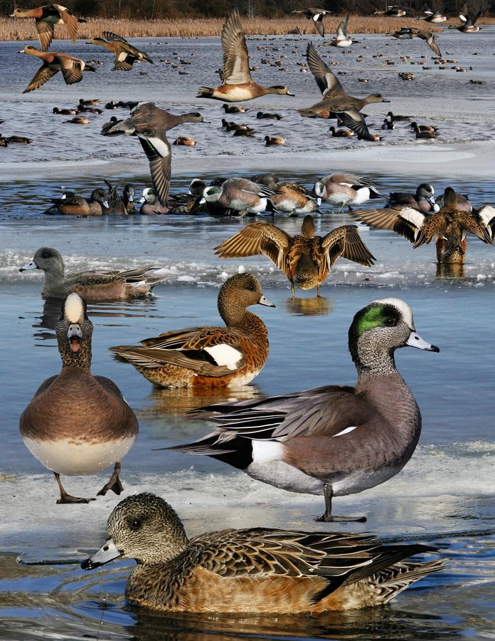 Northernmost breeding dabbler. Widespread and fairly common, often forms large noisy flocks in winter in wet areas or grazing in fields. High-pitched whistles belong on a football pitch. Can be tame, hanging around local ponds with Coots and gulls. Look for striking upperwing pattern of males in distant flocks. Also known as Baldpate for its white/yellow crown. ID: Smaller than MALL with peaked forecrown, small bill, chunky body, long tail, and short legs. Flocks appear as a variety of pinks and burnt oranges with variable head patterns. Male has distinctive head pattern and black tail bordered by white. Eclipse male looks like bright female with large white covert patches. Juv male similar to eclipse male but covert pattern resembles female. Most appear same as adult male by late fall. Females duller with small white wing patches (this absent on most juv females). Gray-brown flecked head usually has smudgy patch around eye. In flight male has the most white on the upperwing of any duck; female much duller, creating flocks of two color patterns.