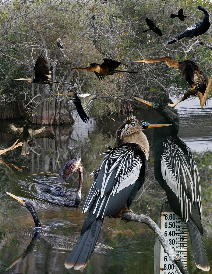 Fairly common locally in wet areas, fresh and salt water with trees, i.e. swamps, mangroves, and canals. Like cormorants, often colonial with other species (usually cormorants and herons). Wanders out of range. Often sits in the open, usually in trees, sunning itself to get dry. ID: Aptly known as ‘snakebird’ given its neck shape. Swims with only head and neck above water. Pointed bill for spearing fish. Often seen in flight and frequently soars high in the sky. Appears as a flying cross; long, thick tail appears to propel a bird that can look almost neckless at distance. Striking; if in doubt it is probably a cormorant. Young (1st-year) as adult female with browner body and smaller dull coverts and scapulars. 2nd-year birds are more adult-like but retain some signs of immaturity. Adult shows striking off-white scapulars and coverts. Male black-necked, tan in female. Breeding birds get brighter bare parts and head plumes.