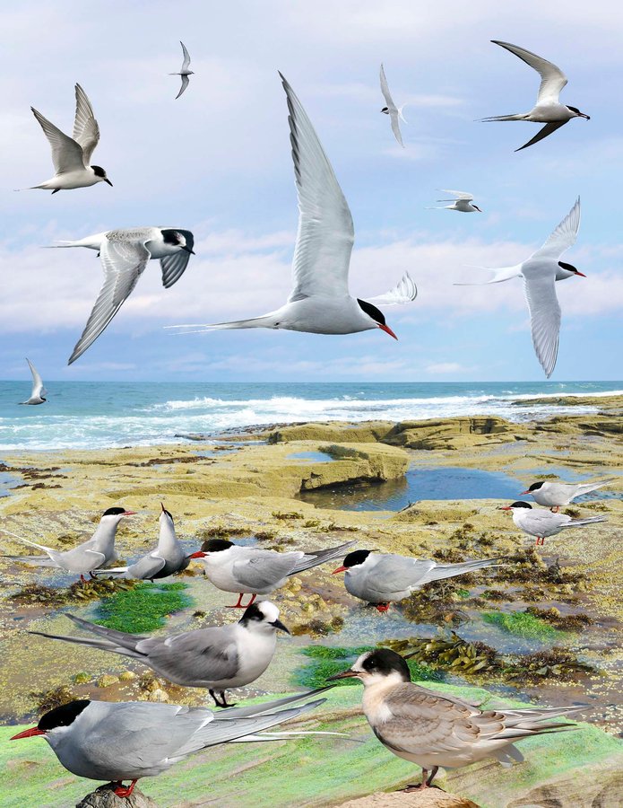 Only tern in far n. Coastal islands to ME. Rare inland and on offshore migration. ID: Very similar appearance and behavior to COTE. ID should be based largely on size and shape. Sitting birds look slightly smaller, ‘neckless’ with more rounded head and very short legs. The disproportionately short neck and long tail is sometimes obvious in flight and gives a front-loaded feel. Ad br: similar to COTE with short, red bill, paler flight feathers, tail projects past wing-tip. Primaries all translucent. Nonbr/1st-s: best differentiated by shape, but paler primaries and small carpal bar create paler appearance. In flight, structural differences, paler primaries (translucent from below) with narrow well-defined black trailing edge. Juv: white secondaries that are striking in flight (compare to dark bar in COTE).