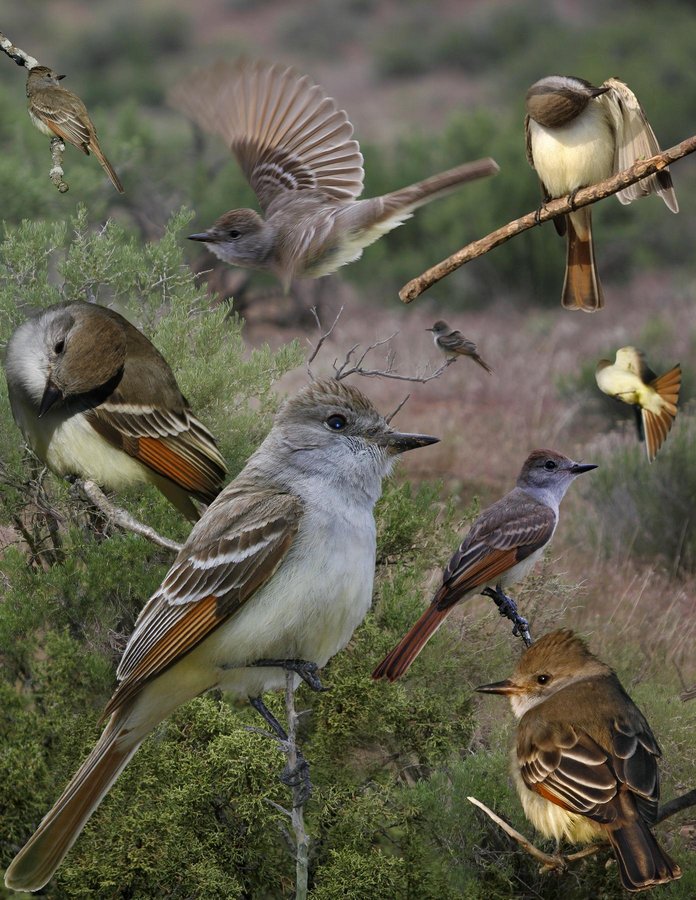 Fairly common sw. species, preferring bushy open areas. Rare winter visitor to FL. Regular but rare migrant to E. In late fall (Nov) any Myiarchus is most likely this species. Typically feeds closer to ground than GCFL and is rarely seen in canopy. Call a rolling ‘ka-whip’ or ‘prrrt’ with soccer-whistle qualities. ID: Smaller and noticeably slighter than GCFL with paler colors. Bold rufous in wing and particularly bold median covert bar create strong contrast in wings. Bill is shorter and finer. In areas of overlap, these features should be enough. If in doubt, undertail has a dark border that extends around tip — limited to sides on GCFL — and white tertial fringes are narrower.