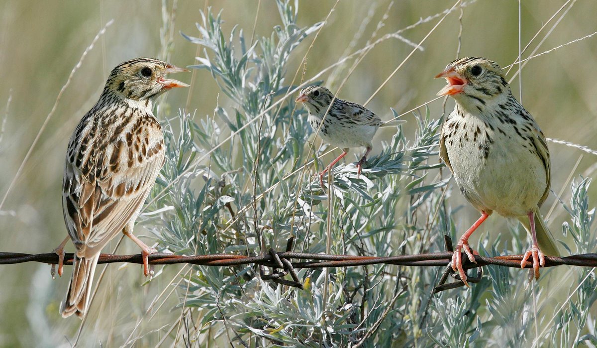 Scarce and local breeder in prairie grassland with bushes and weeds. Secretive and very hard to see. Fairly big with a long bill and relatively long, square-ended tail. General appearance is of an ochre-buff sparrow with white belly, and with isolated streaks across breast. Very similar to HESP in all patterns but is paler, lacks green tones around head, and upperparts are less strongly marked. SAVS common in same habitat, but shape, behavior, and breast streaking pattern are very different. Song: deep clear notes with descending trill.