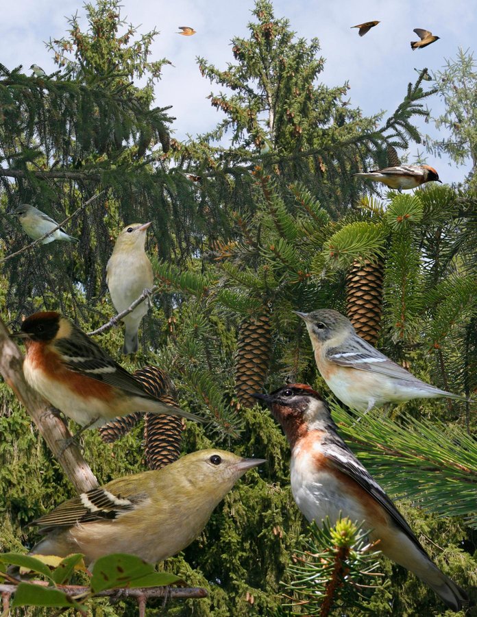 Uncommon to scarce spruce bog breeder in the tallest trees. Also prefers spruce on migration but found elsewhere. Often found with CMWA and BLWA. Call a hard ‘zeet’ or ‘zick’ (similar to YEWA, BLWA, COWA — ‘the zickers’). Song a few high-pitched ‘zee’ notes, similar to CMWA and a short BWWA. ID: A large, powerful warbler, like BLPW with slightly rounder crown and broader-based bill. All plumages have large wing bars, streaked mantle, rufous wash on flanks, and buff wash to undertail coverts. Ad ♂ br: uniquely colored brown cap, throat and breast sides with black mask. Ad ♀ br: duller version of ♂. In fall, all birds have dark eyeline, pale supercilium and pale area behind ear coverts. Rufous flanks are darkest in ad ♂ and palest in 1st-yr ♀. These pale birds are similar to pale BLPW but buffy rather than white on flanks/undertail coverts. They also lack strong yellow tones or diffuse streaks on breast, have greener upperparts with fewer streaks, dark feet, and broader wing bars. PIWA has different shape, and face and color pattern.