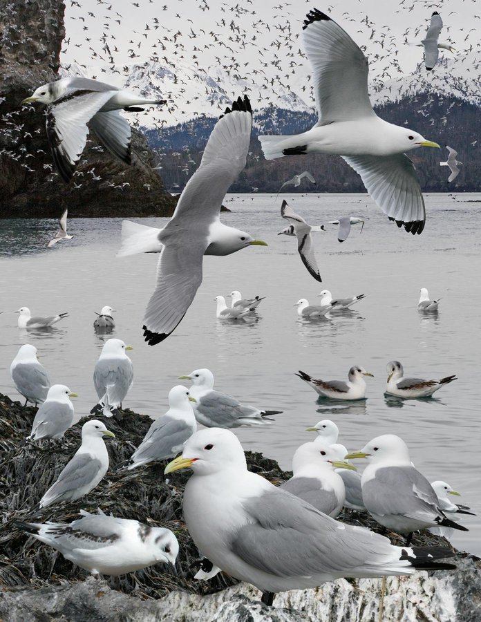 Forms large, spectacular colonies on rocky cliff faces. Pelagic in winter, sometimes within sight of land, particularly in bad weather or where there is plentiful food. ID: An attractive, dainty, clean and well-proportioned gull. Medium-gray upperparts. Short black legs and yellow bill. Buoyant but powerful flyer with long, slim body and wings. Wings often held straight, but sometimes elbow pushed forward creating ‘W’ along leading edge of wing. Stiff shallow wingbeats. Easy to overlook as RBGU, but slimmer, slightly darker with distinctive squared-off black wing-tip and different flight style. Ad br: white head. Nonbr: gray spot to rear of ear coverts. 2nd-year: as adult but some have more extensive black in wing. Juv/1st yr: bold ‘W’ pattern on upperparts. Some have dark ear spot and collar, others all white as adult. Black tail band. Black bill becomes yellow in spring/summer.