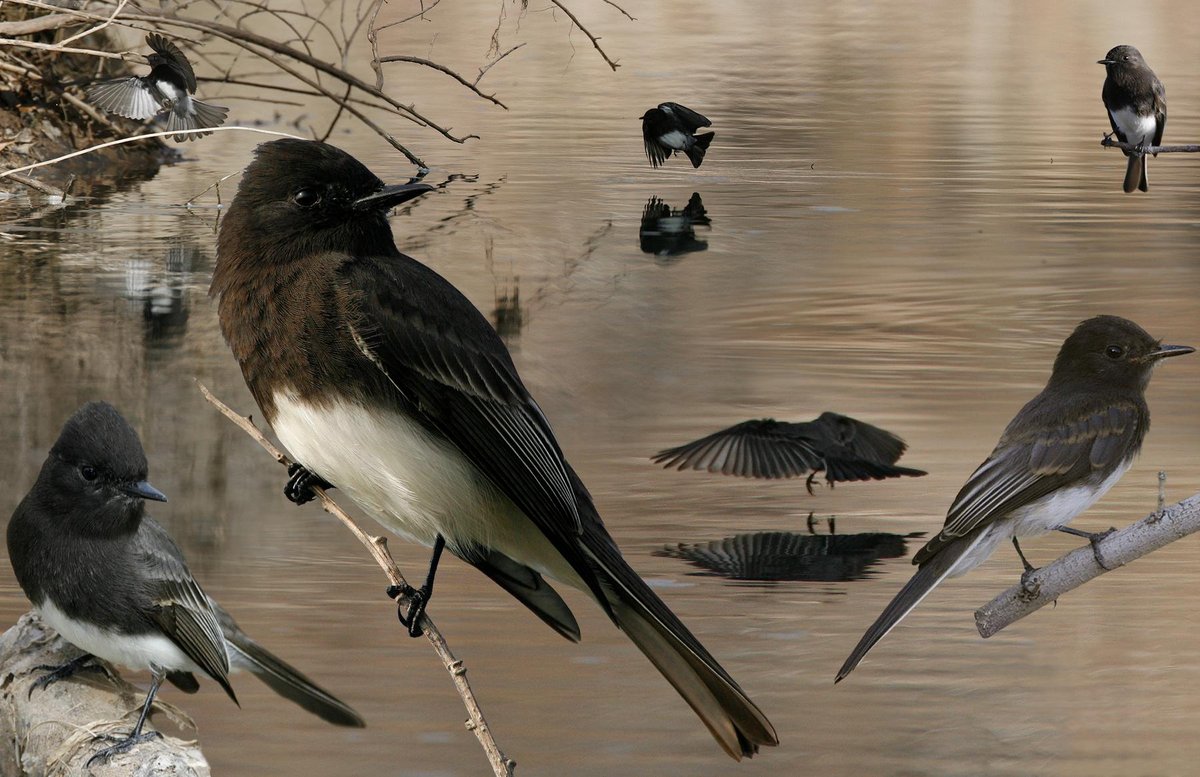 Uncommon in W, usually near water. Very rare in E. Sits low and darts out over water to catch insects. Slim and elegant with long tail and fine bill. Tail is pumped up and down, less deliberately than EAPH. In all plumages, 2-tone colors distinctive. Adult: gray-black, slightly paler on back, but sometimes with a hint of brown. White belly and vent sharply demarcated, extends to center of breast — a very clean look. Juv: similar with rusty-fringed coverts and tertials. Molts into adult-type plumage late summer.