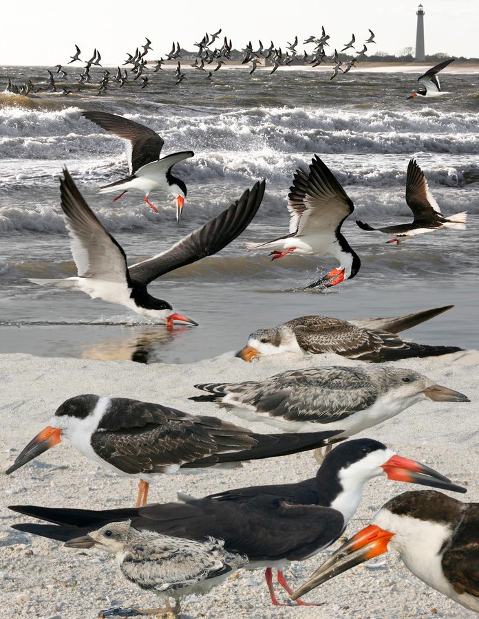 Locally common on beaches and back bays. Colonial and generally roosts in large, dense packs. Weird and unmistakable, it always draws comments. Lower mandible much longer than upper mandible. Lower mandible kept under water for several yards as it sieves small fish. Also picks from surface. Often in tight flocks that make sharp turns in unison with dramatic effect. Sometimes rests with head flat on ground as if sulking. Most active at night and twilight. Yelping ‘yip’, usually repeated, is a common sound night and day. ID: Adult: black upperparts fading to brown. Nonbr: back of neck white. Juv: pale-fringed brown upperparts give scaly appearance. Bill small and dark initially, grows and becomes two-tone. Orange legs. Grows adult-like mantle and scapular feathers through winter and keeps through summer. In fall molts to adult plumage.