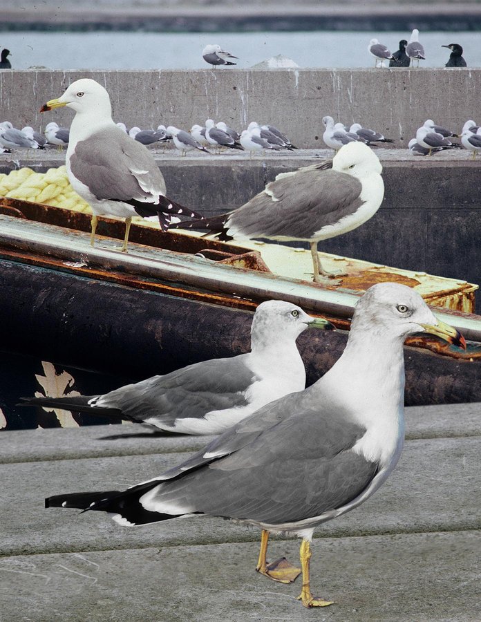 Very rare Asian visitor. Surprisingly, almost annual with mostly adult records of scattered individuals. ID: 4-yr gull. Unusually, all ages have broad black tail band bordered by white. Medium-sized, long-winged, and long, bicolored bill with unique shape. Medium-gray mantle. Yellow/green legs. Features in combination make ID straightforward. 1st-yr (rarely seen and not shown): medium-brown, paler around face and on vent; pink legs.