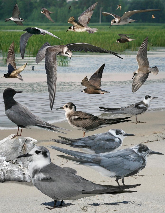 Locally fairly common in suitable freshwater marshes in summer. Colonial. Migrants found anywhere, often with other tern species. Commonest offshore, often in flocks. Only regular ‘marsh’ tern, never dives, swoops down to pick food off surface, enhancing graceful but ‘cute’ image. Buoyant, bouncy flight. ID: Small, compact, with short tail and broad wings. Gray upperparts in all plumages noticeably darker than other regularly occurring terns. Ad br: striking black head and body bordered white — contrast striking at distance. Some white-faced in summer (2nd-s or beginning to molt). Late-summer molting birds blotchy black-and-white. Nonbr: pale underparts. Juv: similar to nonbr but have pale-fringed upperparts. 1st-s: as nonbr with mixture of old and new feathers (old outer primaries). At sea, distant tropical terns are much larger with different shape and relatively slow wingbeats.