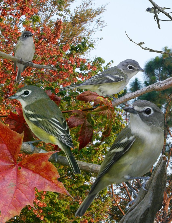 Fairly common high up in deciduous forest. Late fall and early spring migrant. Very slow, deliberate movements with upright posture. Song between REVI and YTVI in speed with sweet notes: ‘seeyou seeme,’ ‘ waitup,’ ‘comewithme,’ ‘werin wereout.’ Call a nasty gremlin-like chatter. ID: Strikingly large. Seems dignified, moving slowly with erect posture and smart colors. Often tilts its head to check things out. Bold spectacles are striking on a gray-blue head that contrasts with olive back and bold wing bars. Underparts clean white with pale green flanks. Never appears scruffy! S. Appalachian population averages larger and darker. Ages and sexes similar (juv scruffy for a short period).