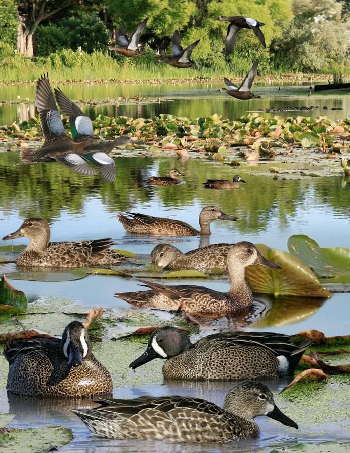 A welcome summer visitor (some winter in the S) usually in pairs or small parties, often announcing itself with a high-pitched ‘kip’. Can be quite tame. Fairly common on a variety of shallow marshy wetlands, usually near vegetation. ID: Small dabbler; slightly larger than GWTE. Sits low and long in the water and with a wide, flattish head, but looks long-necked when head held high. Bill fairly large, broad and all black. Male’s half-moon face is striking at long range. Pale blue coverts striking in flight (but can appear light gray). Eclipse and young males are similar to females at their drabbest but retain bolder male wing pattern. Late summer and fall birds often show a ‘ghost’ of the face pattern and other non-eclipse feathers. Females appear brown-gray with well-defined pale fringes to feathers often creating a neat appearance. Distinctive pale area at base of bill. Often confused with NOSH – check comparative size! Striking upperwing pattern with pale blue forewing, similar to NOSH and CITE.