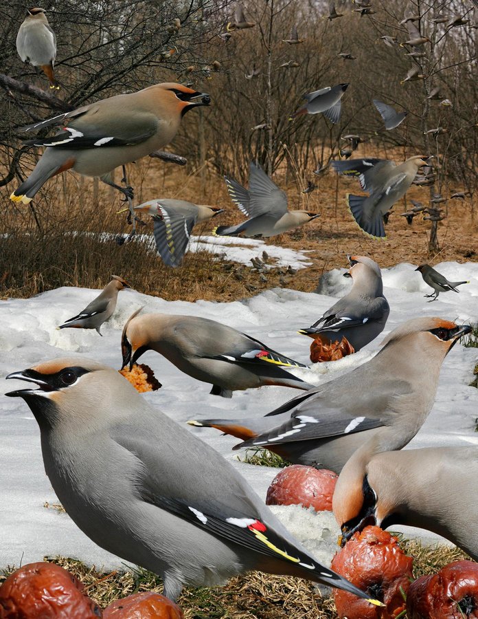 An irruptive n. bird that mostly stops at the border but occasionally comes s. in numbers. Much bigger than its cousin, they quite often party together. S. wanderers are nearly always with CEWA, but sometimes with COST. In winter, usually in flocks, some numbering hundreds. In a harsh environment, they can often be seen swarming around fallen fruit, seemingly gorging themselves as if they might go hungry for a while. Oddly, they frequently flycatch en masse from the tops of trees — a good way to find them. Mobile, large groups can appear and disappear surprisingly quickly. ID: From CEWA by large size, gray coloration, and rich brown vent. Also more extensive pale tips to flight feathers, more extensive dark throat and deeper trilled call. Ad ♂: sharp edge to black throat. Broad yellow edge to primaries. Broad yellow tail band and red ‘rackets’ to secondaries. Ad ♀: soft edge to throat, narrower yellow inner border to primaries, reduced dark on chin. 1st-w: lacks yellow inner web to primaries. Juv: streaked underparts.