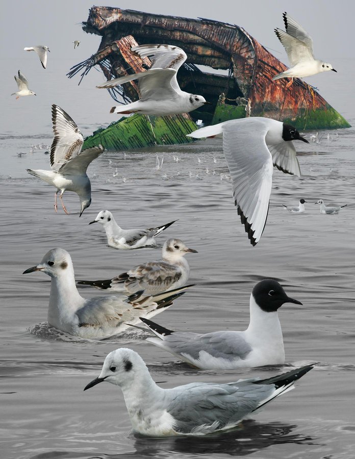 Common locally with plentiful food supply. Often near fast-moving water on rivers, ocean, and lakes but can be found anywhere. Birds follow circuits in flock while feeding before sitting down in groups. Picks food off surface. Has favored sites, e.g. Niagara River, where may gather in thousands when river not frozen over. Breeds in boreal marshes, usually nests in conifer trees. Tends not to mix with other species. Tight flocks often fly in unison. Prefers sitting on water to standing. ID: 2-yr gull. Small and dainty, almost tern-like, with light, buoyant flight and very clean appearance. Pointed wings. Striking wing pattern with translucent outer primaries and neat black trailing edge obvious even at long distances. Pale pink legs. Thin, pointed black bill. Gray extends from hind neck to breast sides. Ad br: slaty blackish hood. Legs bright pink to red. Ad nonbr: dark spot behind ear and pale pink legs. Juv: often orange base to bill; soon darkens. Mantle and head warm brown tones. 1st-w: mantle becomes pale gray and head whiter. Blackish carpal bar, tail band, trailing edge to wing and primary coverts distinguish from adult. Some birds in 2nd-w show signs of immaturity and thus can be aged.