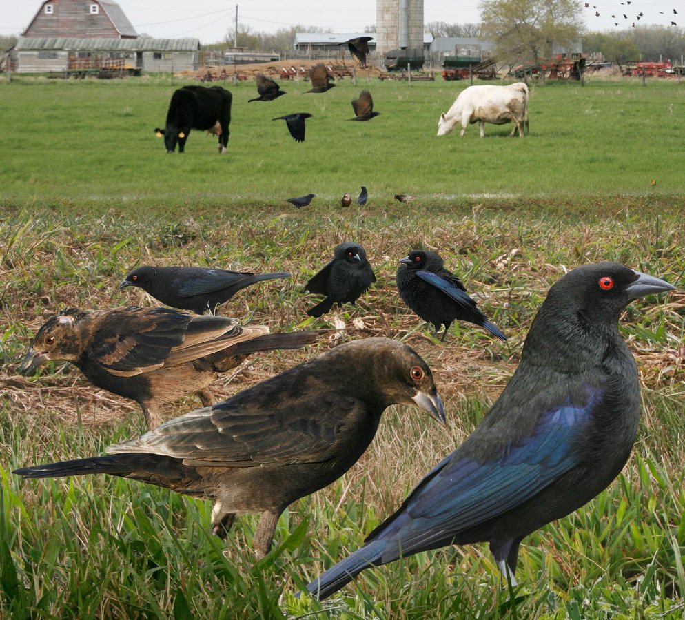 Scarce but locally common in open areas, particularly near cattle and feed lots. The largest cowbird, a weird bird that seems to have a variety of postures. Large-chested with a pointed head, it will suddenly hunch its back, puffing its neck feathers out to form a ruff. ♂: hovers in unique breeding display. ID: Very thickset bird with broad, muscular neck. Heavy, pointed bill extends onto forehead. Bold red iris striking on all but youngest birds. Ad ♂: very dark with contrasting eye and glossy blue wings and tail. Ad ♀: a browner and duller version of ♂ with very little contrast in plumage. Juv: similar to ♀. ♂: grows adult-like feathers through first winter.