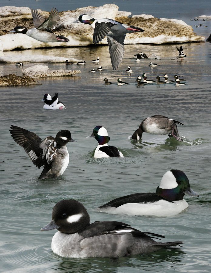 Widely distributed throughout on water bodies, but most concentrated in winter on coastal bays. Forms small, loose-knit flocks. Reminiscent of a little black-and-white rubber duck, bobbing up and down but often out of view. Brown females are less conspicuous. ID: Very small and squat with oversized head often punked-up at rear crown. Head darkest brown with obvious white cheek patch, distinctive at distance. Imms and adult females look the same in winter though in flight imm females often lack white on greater coverts. Males are striking. Beautiful iridescent head colors usually appear black. In flight, Bufflehead often appear as a blurry ball with wings.