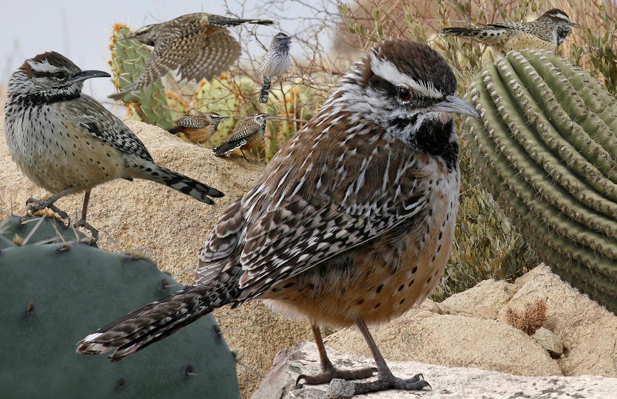 Uncommon in desert areas, often near houses. Massive for a wren, it can be hard to place to family. Vocal, a churring series of notes, common on old w. movies. Hops on the ground, perches on cactus, and is often approachable. Large, domed nest familiar site in cactus crook. ID: Big and fat. Dark throat and striking head pattern obvious at distance. There are spots, streaks, and bars just about everywhere.