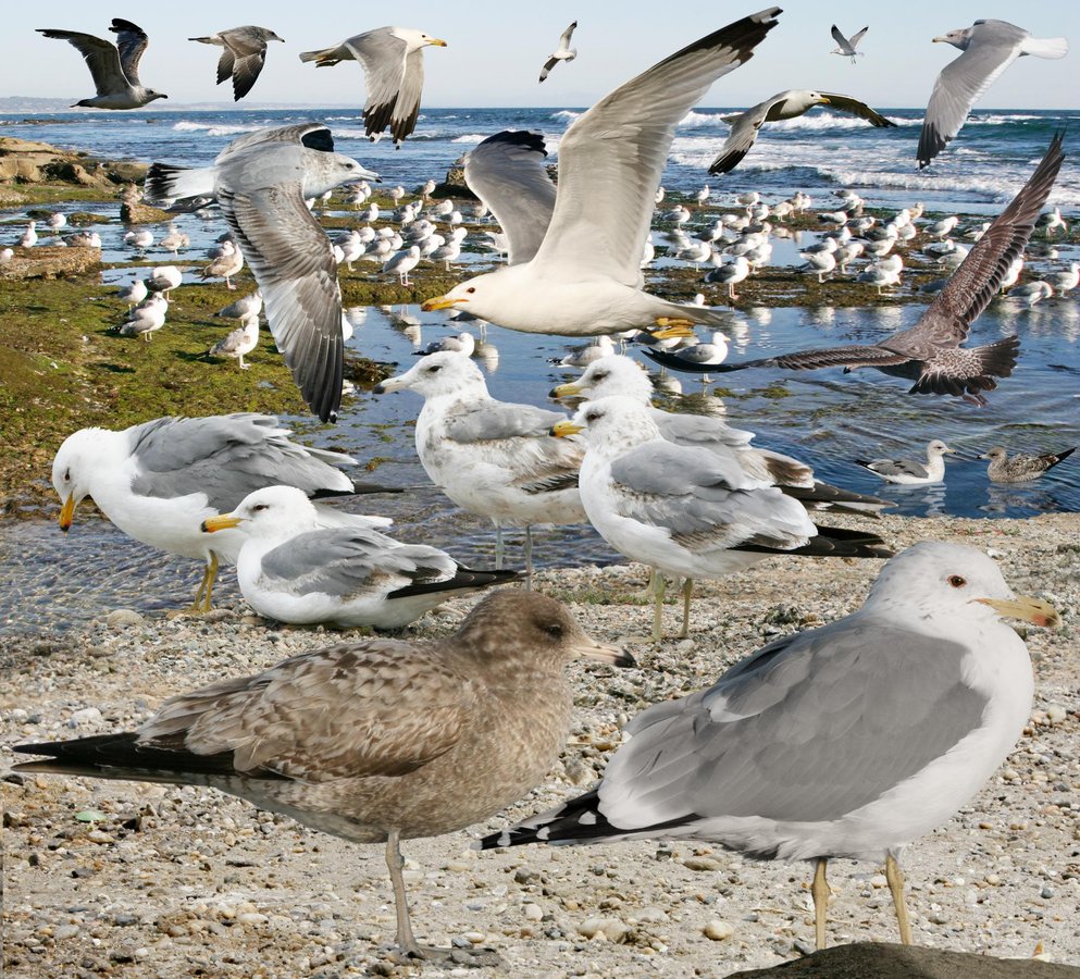 Uncommon breeder in W. Rare but regular migrant to E, mostly winter. Easily overlooked. ID: 4-yr gull. Intermediate between RBGU and HEGU in size (including bill) and features. Found with both so comparison usually possible. Long wings. Long parallel-sided bill, thinner than HEGU. Imms show 2-tone bill, red-and-black bill spots in older birds. Slightly darker mantle and yellow/green legs, in combination with size and bill shape, are diagnostic in older birds. Extensive black on wing-tips. Younger birds fairly uniformly checkered warm brown (like some HEGU). Focus on size, shape, and upperwing with dark greater coverts and inner primaries. Ad br: medium-gray upperparts, dark iris, red orbital ring, yellow-green legs, red and black on yellow bill. Nonbr: streaking on head strongest on nape. 2nd-s and older: as adult. Juv: all-dark bill soon becomes bicolored (as RBGU and some HEGU). 1st–w: feathers molted in through winter with variable timing and appearance. 1st-s: some get medium-gray adult-like feathers on mantle, others may not show this until reaching 2nd winter.