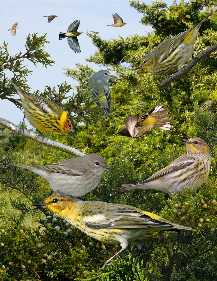 Uncommon breeder in evergreen forest, particularly spruce. On migration uses many habitats, but favors cedars and often drinks nectar from flowering trees. Sometimes occurs in small groups. Varied and sometimes nondescript appearance may confuse. Song is short, a series of very high insect-like ‘seet’ notes. ID: Distintive shape. Fat, pot-bellied bird with a small head that often looks pointed. Bill is narrow, pointed and, importantly, slightly downcurved. Tail is short and narrow. Head has poorly defined eyestripe and supercilium with broken eyelids, a pattern shared by few. Underparts always have some diffuse streaking. One of few warblers with yellow-green on rump. Ad ♂ br: everyting bold and bright with red-brown ear coverts. Dull version in fall. ♀/imm ♂: duller with gray ear coverts, narrower wing bars. Imm ♀: sometimes confusing, drab gray and olive toned with diffuse breast streaks and weak wing bars. Rump greener, but remember shape and head pattern!