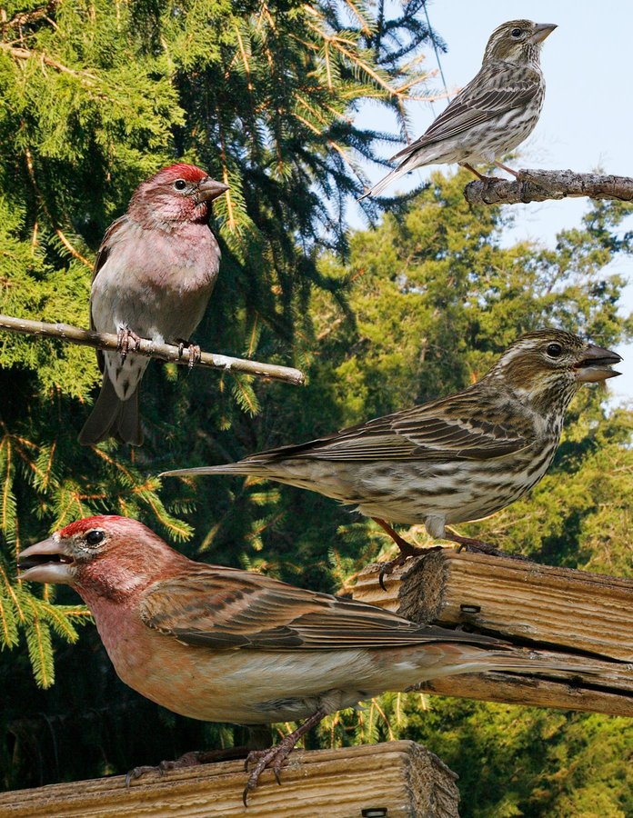 Very rare w. visitor. From very similar PUFI by larger size with more elongated look, slimmer-necked and flatter-headed with longer bill. Primary projection also longer. ? has brightest red on crown. Streaked undertail coverts and white eyering, both lacking in PUFI. Squeaky disyllabic call.