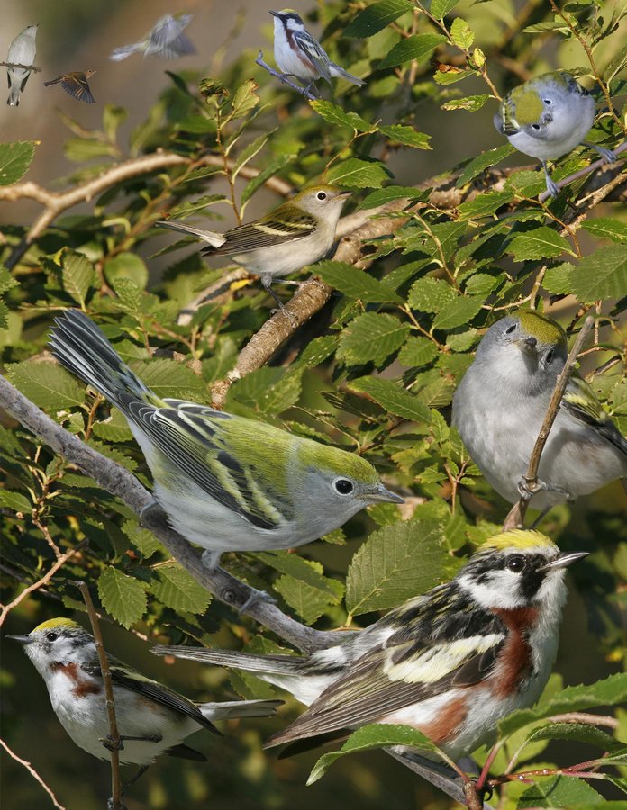Common breeder in second-growth deciduous forest. Emphatic ‘pleased ‘pleased pleased to meetcha’ a common welcoming song. Usually moves around mid-story and seems to have its tail perpetually cocked at 30 degrees. ID: A fairly large, chunky warbler with bulging chin that gives a thick-headed look. Broad-based pale bill. 2 distinct plumages. Ad ♂ br: yellow crown, black whisker stripe, chestnut flanks, black-and-gold upperparts create a very spiffy, unique look. Ad ♀ br: similar to ♂ with subdued pattern. Fall birds all similar and also attractive. Lime-green upperparts with wing bars that nicely compliment pale gray underparts. Bold white eyering stands out on such a clean background. Some fall adults show chestnut on flanks.