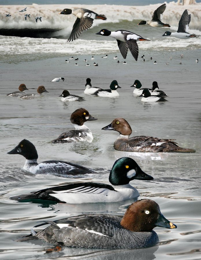 Common and widespread. Breeds on deep lakes and rivers in forested areas, nesting in nearby tree holes. In winter often forms flocks with many dispersing to the coast, but quite at home in cold landscapes. Often found in similar habitat to COME. Male’s wings in flight produce loud whirring whistle noise. Often seen flying overhead as they move between feeding areas. Very wary. ID: Medium-sized duck with an oversized head that juts out from the back of the neck, but not so extreme as in the scarce BAGO. Large black triangular bill with variable amounts of yellow. Always seems alert and ready to dive, but always keeps an eye on you. Females’ and juvs’ brown heads contrast with gray bodies. Eclipse and 1st-w males similar but have extensive white in wing and develop a partial white face patch. Young males molt through first winter/spring into a variable dappled and dingy version of adults. Adult-like by summer. Adult male appears white-bodied and dark-headed with striking round white cheek patch. See BAGO for comparison. Animated displays.