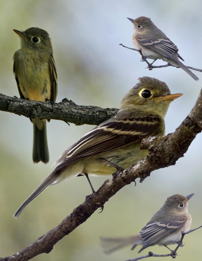 Very rare in late fall and winter. Formerly Western Flycatcher and best still treated as one, being impossible to separate in field. Most similar to YBFL but slightly slimmer and longer-tailed. Browner-winged with less distinct wing bars and tertials. Eyering tends to be rounder and back browner. Frequently flicks tail. Call a disyllabic ‘sew-wis’ or ‘seet.’