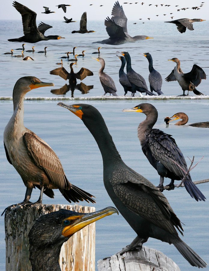 Widespread and very common. Often approachable and found near humans. Occasionally forms massive feeding flocks on lakes where food is plentiful. Also happy in salt water. Creates long, haphazard lines in flight, a familiar site on migration. Often glides. ID: Very variable in color (variation poorly understood). Easily mistaken for both GRCO and NECO, though it is only species found over much of its range. Always check size, tail length, head patterns, and underpart color (1st-years). Up to 1 year old, shows great variation from white to brown underparts and everything in between, but always paler on neck than belly. Gular patch and loral skin varies from deep orange to yellow-orange and is large with smoother rear edge. 2-3-year-olds and nonbr adults (4 years) similar, with varying amounts of brown mixed with black feathers, particularly on neck. Breeding birds shiny black. 'Double-crest' hard to see and varies from white to black. When soars, can be confused with ANHI.