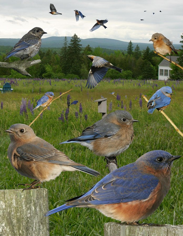 Fairly common in open countryside, golf courses, parks, orchards, and anywhere with scattered trees. Happy in larger gardens and can be attracted by nest boxes or natural cavities, though you may have to kick out HOSP and COST. A familiar and very popular bird. In late fall gathers in flocks, when its light, mellow shorebird-like ‘tewlee’ is a regular overhead call. Song a longer warbled version. Sociable, sits on fenceposts and small trees before dropping to the ground to grab dinner. White belly and vent on otherwise orange underparts. In winter often in mixed flocks. ID: Fairly small and plump. Often seems neckless with shortish tail. All plumages duller in winter, often with buff fringes. Underparts orange with white belly and vent. Ad♂: beautiful blue upperparts brightest in spring. Ad ♀: duller with pale throat and partial eyering. 1st-w: similar to ♀ with some retained juv coverts and flight feathers. Ageing and sexing is difficult! Juv: dark-spotted plumage held briefly.