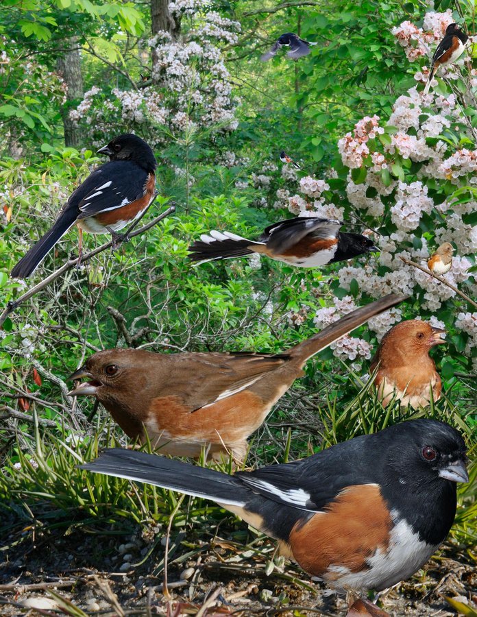 Common in secondary growth woodland and brushy scrub. Often on the ground in leaf litter, can be heard scratching around, and will jump forward with both feet and send leaves and dirt flying backward. Prefers to stay hidden and is more often heard than seen, calling ‘tow-hee.’. Sings a higher ‘drink-your-tee,’ the last part a higher-pitched trill. ID: Large, bigger than sparrows and other birds with similar behaviors. Chunky and thick-necked with a long rounded tail. All plumages have same color pattern with dark upperparts and throat, rufous flanks, and white belly. White corners to tail and bases to primaries are easiest to see in flight. Extensive white on undertail. Ad ♂: upperparts and throat black. Eye color red in the N. S. birds frequently have white eyes and less white in wing and tail. Ad ♀: black replaced by brown. 1st-yr: almost as adult.