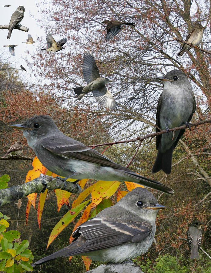Common flycatcher in deciduous and mixed forest. Often confused with Empidonax, but unlike them it will sit on exposed snags for long periods, scanning the area. After spotting its prey, it makes long sorties to snap it up, often returning to the same perch. Vocal, it often gives its presence away by a drawn-out, 2-note ‘peee-weee.’ Several calls: ‘chip, peeyer, peer’ and much variation. ID: Fairly large with peaked crown and long, usually forked, tail, which enhances slim appearance. Wings are long and pointed with primary projection equal to tertial length. If in doubt, make sure you check this feature. Often looks quite dark-faced. Has indistinct or no eyering with mainly dark lower mandible. Undertail coverts show dark centers, and never flicks tail. Underparts darkest on breast sides, creating a subdued version of OSFL. Juv: similar to adult but fresher plumage and broader, buff wing bars.