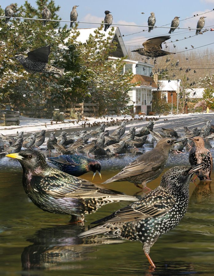 Very common and familiar. Despite its bad reputation, EUST has a subtle beauty. Nests in man-made cavities but also competes for natural holes, often kicking out woodpeckers and other species. Forms large waxwinglike flocks in winter, flying around in tight balls, often with a confused raptor nearby. Stomps around, sometimes inquisitively, at other times marches in a hurry, grabbing food with a big open mouth. Song: a mishmash of whines, whistles, and imitations all wrapped into one. ID: Stumpy with a short square tail. Distinctive profile in flight with broad-based triangular wings. Flight is a series of rapid flaps, followed by short glides. Bill fairly long, straight and pointed. Adult: brightest in fall/winter, fresh feathers with large white spots on iridescent purple and green, though often looks black. Dark lores give mean look. By spring, spots are worn and iridescence becomes more obvious; bill turns yellow. Juv: brown, palest on throat, dark lores, and striking pale fringes to wing feathers. Molts through summer to very different adultlike feathers, giving a pied appearance.