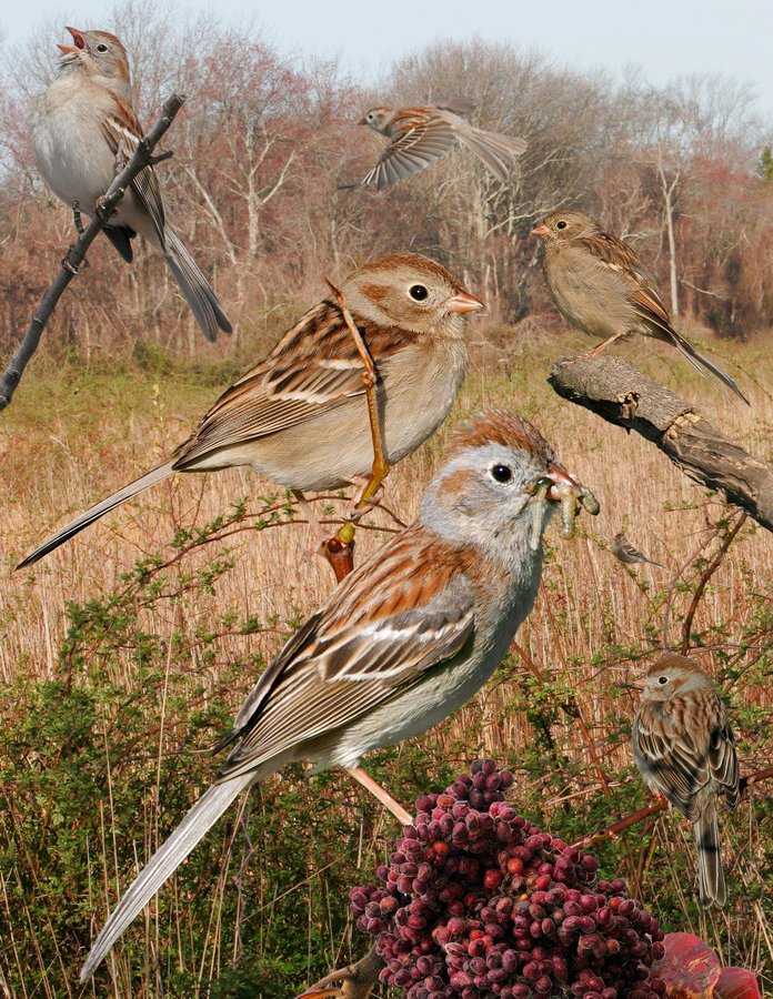 A fairly common sparrow in overgrown fields with bushes. Gives familiar song in these habitats: long clear notes accelerating like a bouncing ball, repeated at different pitches. Weak ‘tsee’ call note. Sits on brambles and bushes but can then disappear for long periods. In winter, and on migration, forms flocks, sometimes with other species but most often not. Feeds on seed heads, and spends more time on the ground in winter. ID: A slim, long-tailed sparrow, though can look chunky at times. Plain-faced look emphasized by bold eyering and pale lores. Unstreaked underparts. Overall color usually appears buff but some birds are grayer. Lacks strong contrast of ATSP and CHSP. If in doubt, always look for the all-pink bill.