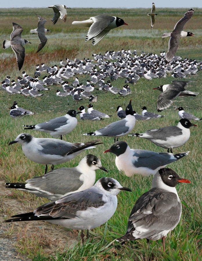 Abundant in Great Plains, often in dense 'packs' on farmland and lakes. Texas only place where ranges overlap with LAGU, other than vagrants. Covers large areas looking for food, often soaring fairly high in packs. Can be found following the plough. Colonial, nesting in marshes. ID: 3-yr gull with dark mantle like similar LAGU. Smaller, more compact with shorter bill. Short, thick neck. Faster and shallower wingbeats. Bolder white eyelids. Smaller hood and whiter neck in summer. Bolder partial hood in nonbr/imm. Less black in wing-tips, usually bordered by white - particularly striking overhead. Ad br (Apr-Sep): often has pink flush on breast. Large white wing-tips, but variable with tips quickly worn away in summer. 2nd-s: subtly different from adult, averages less white in wing, has darker bill and duller hood. Nonbr: boldly patterned partial hood. Juv (Jul-Aug): plumage held briefly. 1st-w (Sep-Apr): similar to LAGU but white neck and underparts with narrower dark tail band and bolder head pattern. 1st-s: variable head pattern, gray upperparts, much as ad nonbr.