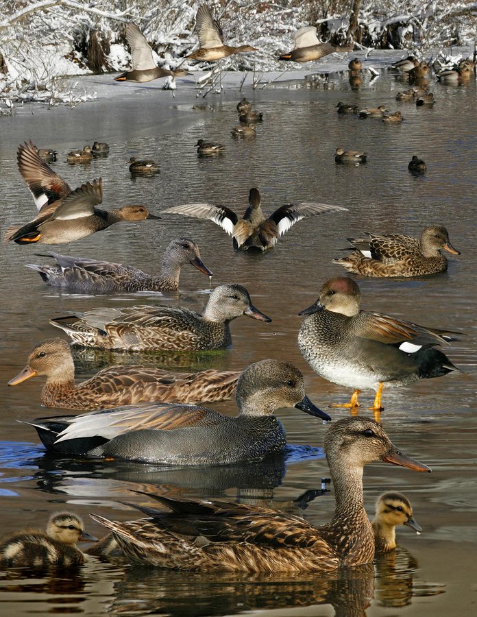 A common duck of shallow wetlands, mostly seen in pairs but sometimes larger groups. Superficially nondescript, so is easy to overlook, particularly when mixed in with other more striking dabblers as often occurs. ID: Slightly smaller than MALL. Distinctive nipped-in neck and steep forehead often gives square-headed look. Head is larger in males than females. Sits high in the water. Male not so striking as some ducks but is intricately patterned and always has striking black butt. Female often confused with MALL and other female ducks but look at shape and orange-sided bill. Pale head contrasts with darker upperparts — solid dark feather centers with diffuse pale fringes. Strong eyestripe. Striking in flight. Upperwing shows white square bordered by black, boldest in males. This can also be seen on some sitting birds. Underparts in flight also quite striking: distinct white underwing and central belly bordered by dark. Male beautifully detailed at close range. Some color variation. Females described above but note bill often darker in summer. Juv males as female, grow adult-type feathers through first fall/winter. Aged in late winter by female-like upperwing pattern and juv feathers in black uppertail coverts.