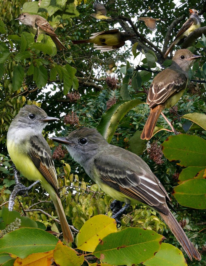 Common and familiar in ones and twos anywhere with deciduous trees. Scare winter visitor in FL. Lives in the canopy, where it catches insects, or feeds on fruit and other goodies. Tough to see but vocal, far more often heard than seen, giving a raucous and far-carrying ‘reep,’ or rapid, repeated ‘reep reep reep.’ Often sits quietly, or flits around and hovers as it picks fruit. Like other Myiarchus, often tilts head to one side inquisitively. Frequently flies across open spaces to other trees, sometimes with a second bird in pursuit. ID: A large, sturdily built flycatcher with bright yellow belly. Long and slim, it also appears muscular with thick neck and large broad-based dark bill. Gray throat and upper breast contrast nicely with lemon-yellow lower underparts, often creating a hooded effect. Upperparts browner with obvious rufous tail and primary panel. Juv: rufous fringes to coverts. These are quickly molted to adult-like plumage.