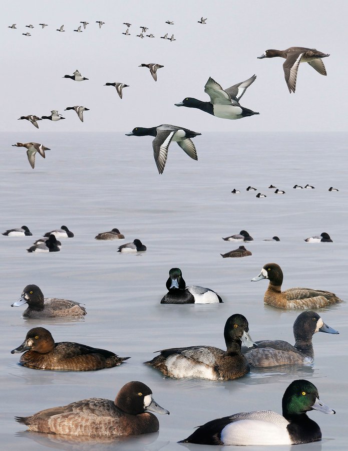 Fairly common though often localized n. breeder. Often forms large flocks in winter in deepwater coastal bays, estuaries, and sometimes on the ocean. Often mixes with very similar LESC. ID: Sometimes differences from LESC are obvious and other times a real head-scratcher (see LESC for comparison). A large diving duck with broad head and evenly domed crown, thick neck and bulging cheeks. Broad bill flared at tip with black typically extending off the nail onto leading edge of bill (usually restricted to nail in LESC). Sometimes with other diving ducks; comparing size is a good id starter. Females appear fairly uniform brown with variable amounts of gray mixed in and well-defined white around base of bill. Worn birds (late winter/summer) often show a white cheek patch (more so than LESC). Imms as adult female but initially darker brown iris and generally more uniform brown. Bill shows less white at base. Male’s iridescent green head often appears black, but almost never purple. Eclipse/imm male initially as female; usually finish molt into bright plumage by late fall (LESC later).