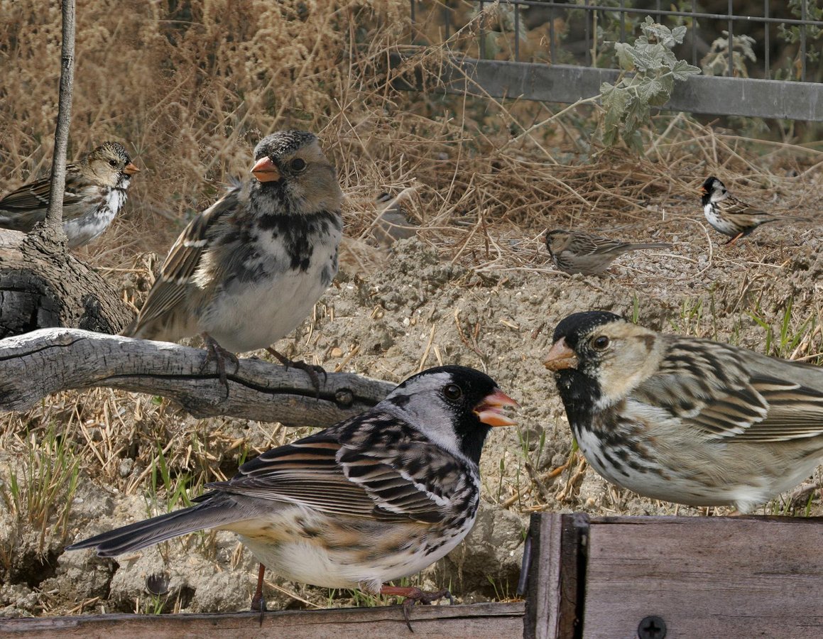Uncommon in Great Plains, very rare visitor to E, often at feeders in winter. Found in hedgerows and brush in open areas, often with other Zonotrichia sparrows. Song like WTSP, at one pitch. ID: Largest and heaviest sparrow, its bold head pattern usually stands out. Pink bill and white underparts give it a cleaner look than other sparrows. Ad: gray-headed with solid black crown and bib. Nonbr: brown-headed with patchy black on crown and bill. Shows much variation and often difficult to separate from 1st-w., which has whiter throat bordered by black malar stripe.
