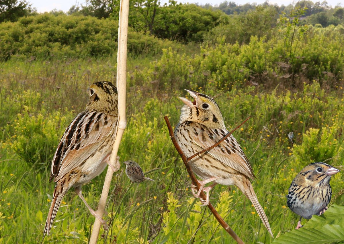 Scarce in grass fields with lots of weeds, also reclaimed strip mines. Winters in wet weedy areas and understory of pine woods. Another skulker that freezes or walks away rather than fly. Best seen singing its weak song, a 'tss-zlik' when often sits on stems but not fully in the open. Sings until Aug. ID: Large head with broad-based bill with strong lime green tones around face (when seen well). Boldly scaled upperparts with bright rufous greater coverts and tertials. Buff breast band with bold black streaks. White eyering. Can look surprisingly like SOSP at distance.