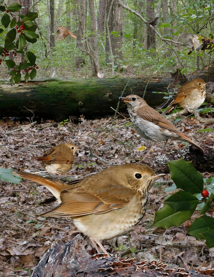 Common in a variety of forests, often with open understory. The last thrush to migrate in fall, the only one that winters in N Am, and the earliest n. in spring. Spends much of its time hopping on the ground, quite happy to come into the open, particularly in the early morning sun. Frequently flicks its wings and deliberately cocks its tail. Often seems to be trying to stand as tall as it can. Its distinctive ‘chuck’ call is a good one to learn. 2-part song, first part trailing off, second part higher-pitched than first. Different pitch when repeated. ID: A fairly distinctive thrush. Small and chunky often with tail cocked. Upperparts variably gray or brown but always with contrastingly rufous tail and wing panels (bases to primaries and greater primary coverts). Bold spots to throat. Some have bold eyering and lores approaching SWTH — size, shape, and upperpart color never overlap. BITH is always dark.