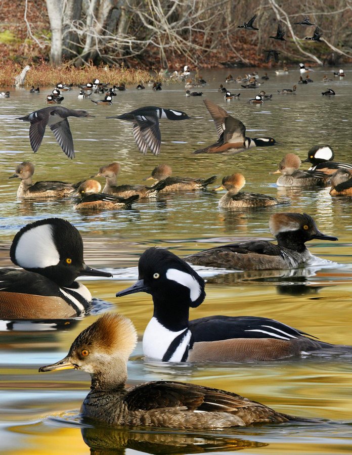 Fairly common and widespread, particularly as you go e. In summer, found on marshy ponds and streams with trees available for nesting. In winter, more often in coastal harbors, and on marshes, ponds and creeks. Usually in small groups but often gather to roost in large flocks at favored location. Mobile and often seen in distinctive flight: slim but compact with very fast shallow wingbeats. ID: Clearly the smallest merganser. Crest opens like a Victorian fan. Long tail often held cocked. Females, eclipse males (retain gray coverts), and juvs have brown overall appearance. Young males develop dark around eye, white in crest, and black bill through winter. Adult at 1 year old. Adult male striking with funky crest often spread.