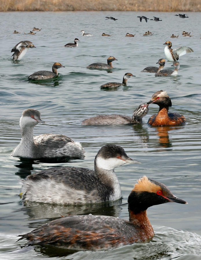Some breed in nw. marshes in E. In winter, scarce on inland lakes but fairly common on the ocean and coastal bays. Sometimes in loose roosting flocks. ID: Fairly small, even proportions. Vertical posture with clean outline to cap and neck in nonbr. Breeding colors striking but rufous color can look black at distance. Bold red eye. Molting birds,in Apr/May, are very variable and often confused with EAGR. Structure, and head and bill shape remain constant. Peculiar shape in flight with head held higher than body.