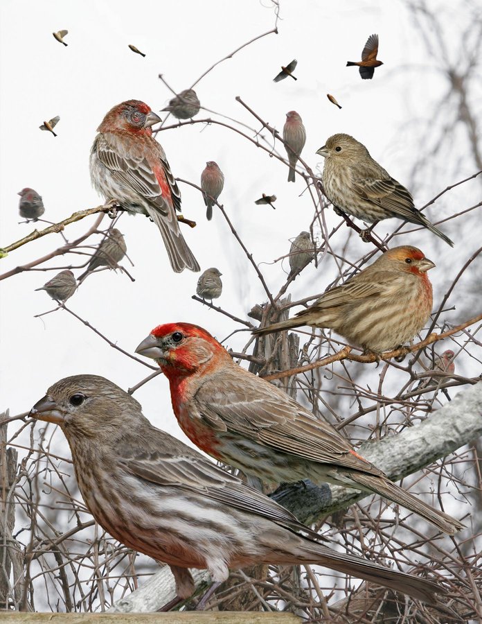 The common and familiar finch in most areas. Found just about anywhere, suburbs, feeders, wooded and scrubby areas. Conjunctivitis, most easily seen as swelling around the eyes, drastically reduced numbers but populations now recovering. Often in small groups feeding on seed heads on the ground or in tangled vegetation. Often easiest to see flying overhead. Call a ‘qwee-er.’ Song: 3 loud warbled phrases, fastest at the start. ID: Much slimmer and longer-tailed (square-ended) than other Carpodacus finches, and lacks strong contrast of other species. Edges to bill are noticeably curved. Plumages show a lot of variation but all have extensive blurry streaking on flanks and diffusely marked upperparts. Ad ♂: red (not pink) usually restricted to head, breast, and rump. Red occasionally shows as yellow or orange where diet is atypical. Ad ♀: relatively dull and nondescript; underparts diffusely streaked on white or buff. Weak face pattern. 1st-yr: similar. The commonest ‘unknown’ feeder bird!