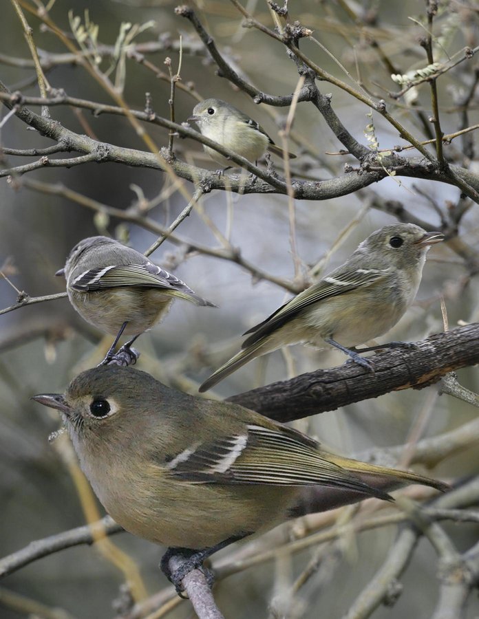 Very rare in w. TX (Edwards Plateau). Looks just like a RCKI but larger with a thicker neck and a thick bill. Eyering broken at top and subtly different. Lacks black bar at base of flight feathers. Blue legs. Different song and call.
