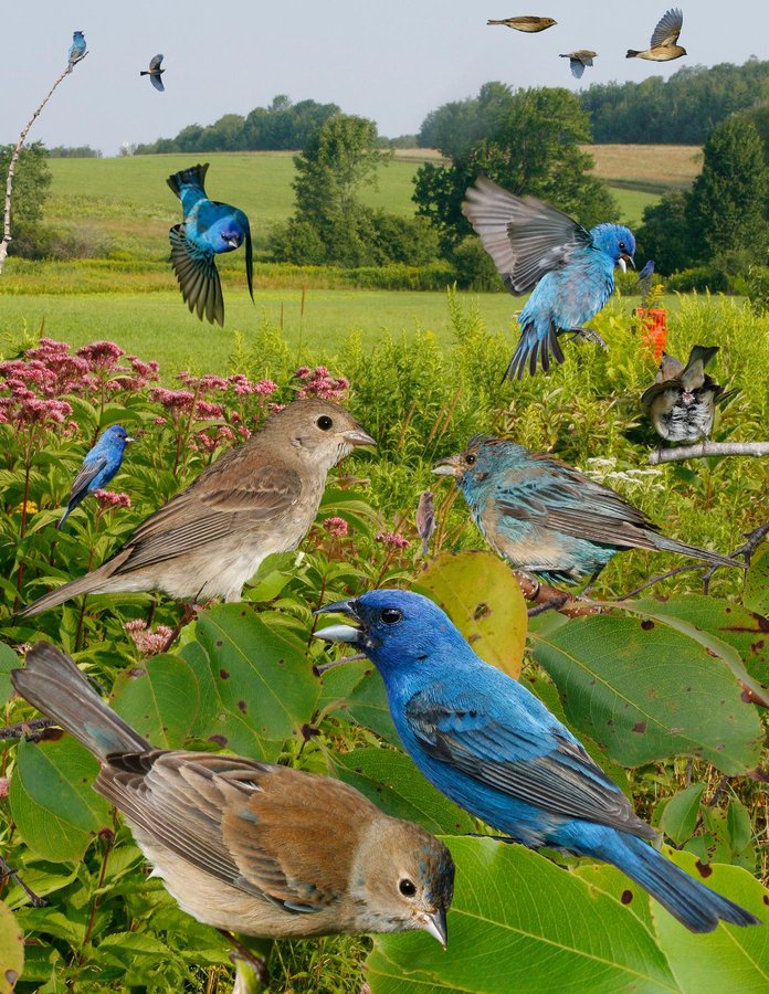 Very common and familiar bunting of open countryside with fields and trees. Usually found alone, sits on trees or wires, belting out its song with head held back, often during heat of the day. Feeds quietly on seed heads on grass verges and in fields, occasionally on the ground. On migration sometimes occurs in large numbers in fallouts. Song: a series of doubled-up high-pitched notes trailing off at end. Call a ‘spik,’ like other similar buntings. ID: A small, nicely proportioned bunting. Conical bill appears pointed but not large like BLGR. Ad ♂ br: superb indigo blue (it can look black in poor light), darker around lores, wings, and tail. In spring and fall has varying amounts of nonbr brown feathers mixed in. Ad ♂ nonbr/1st-s ♂: a mixture of brown and blue feathers. Ad ♀: brown above with two narrow wing bars; paler underneath with indistinct streaking often visible. Some ♀s have some blue on head, wing, and tail. 1st-w: like all-brown adult ♀ but with more pronounced streaking on underparts.