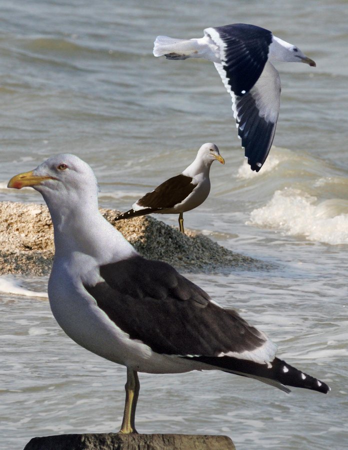 Very rare. ID: 4-yr gull. Has bred in L.A. where hybridized with HEGU. Only older birds safely identified by combination of almost black back and yellow-green legs. Look for wing-tip pattern (usually 1 mirror on outer primary) and bill size/shape. Younger imms: similar to a big LBBG with a large bill.