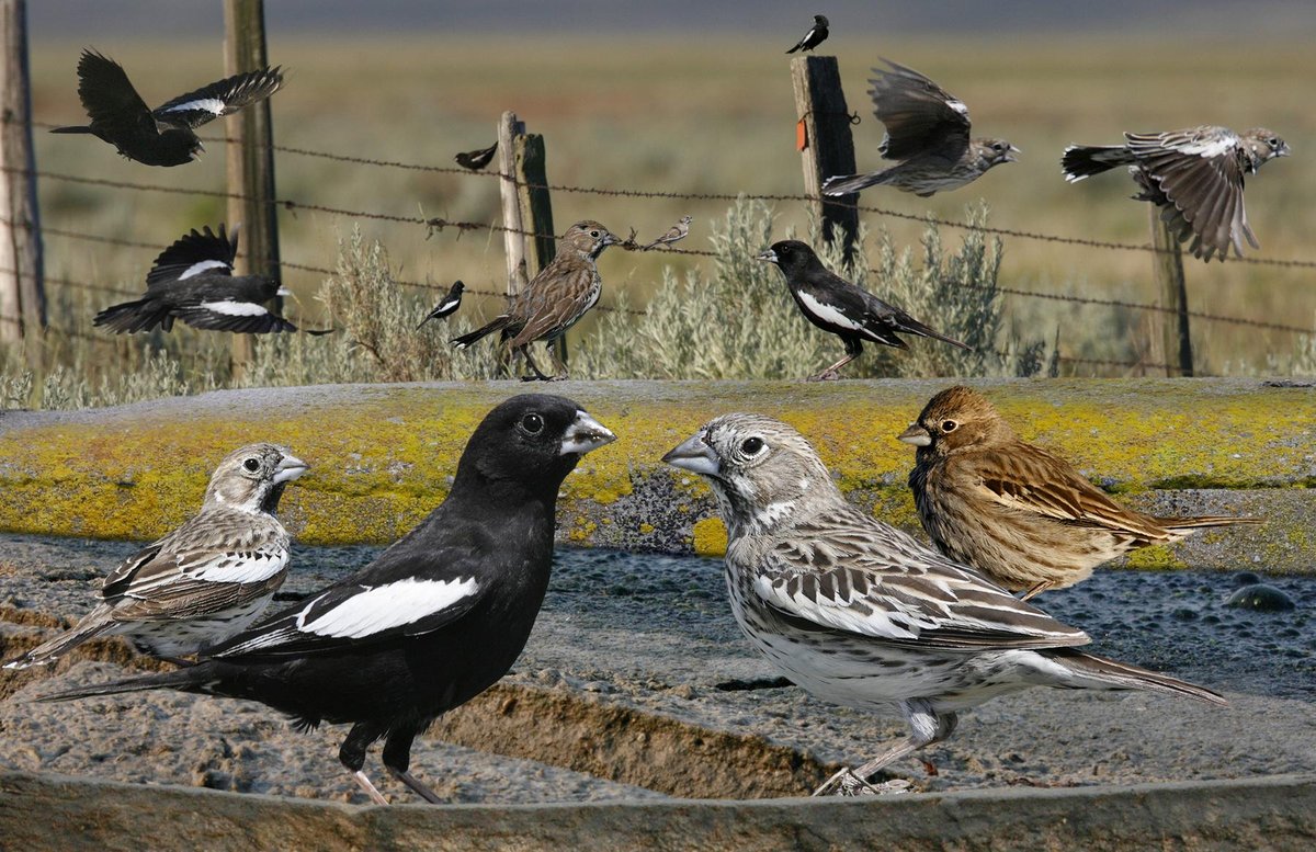 Fairly common breeder on open prairie. In winter forms tight, sometimes large, flocks, often in agricultural areas. Very rare in E. Commonly seen sitting on fences. ♂s sing in display flight. Song: mockingbird-like batches of trills and rattles. ID: Distinctively large and big-bellied. Head is blocky and with a large conical bill. Large white wing patches in flight. Ad br ♂: solid black-and-white plumage in summer, But a patchwork of brown and black spring and fall. Nonbr: ♀-like with black primaries and darker throat/face. ♀: brown, usually with white throat.