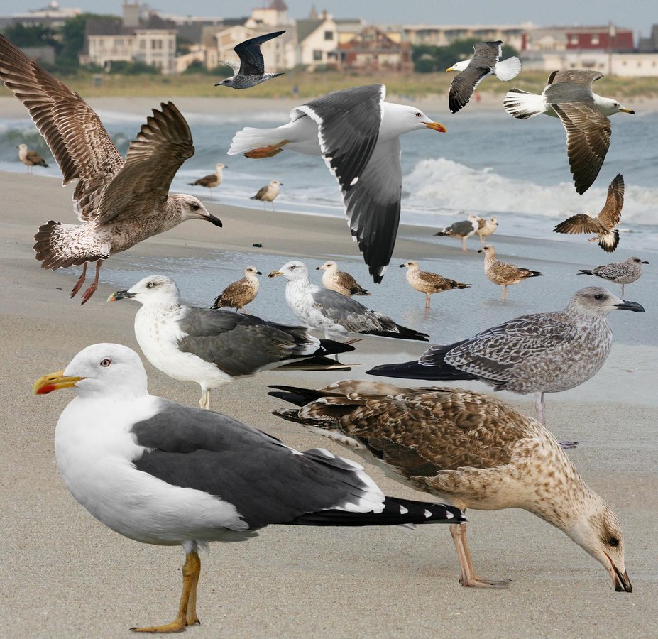 Increasingly common. Found with other large gulls, but particularly on beaches and in grass fields. Probably breeds but not confirmed. Mantle color makes it the one to rule out first when finding potentially rarer gulls. Also hybridized with HEGU often enough to be a problem – these show intermediate characters. Back color variably gray, most appearing to be the relatively pale W European race ‘graellsii’ (shown in plate), others darker. ID: 4-yr gull. Slighter and longer-winged than HEGU. Often looks slim-necked and small-headed heightening attenuated appearance. Color patterns, particularly imms, closer to GBBG. Bill usually slim. Picked out from the crowd by back color and yellow legs (older birds), but confirm with bill, size, and proportions. Imms: often easier to spot in flight due to general uniform pattern, contrasting with white ‘rump.’ Ad br: medium-dark gray back. Yellow legs. Bright yellow bill with red spot. Red orbital ring . Yellow iris. Extensive black on wing-tips, usually one mirror. Ad nonbr: variable amounts of well-defined streaks on head and neck, strongest around eye giving mean expression. 2nd-s/3rd – yr: as adult with imm feathers (mostly coverts). Black in bill often noticeable as yellow develops at tip and base of lower mandible first. Black in tail gradually molted. Most, but not all, have yellowish legs. Juv: uniformly dark-checkered. White underparts with well-defined streaks often noticeable. Dark around eye, black bill and shape in combination usually stand out from HEGU. Dark bases to greater coverts and pale rump, easiest to see in flight. 1st-yr: mantle and scapulars have more complex internal markings. By summer can appear more uniformly dark and dingy with contrasting dark-spotted pale underparts. Gray adult-like mantle and scapulars grown in through 2nd winter, and all-black bill develops some yellow.